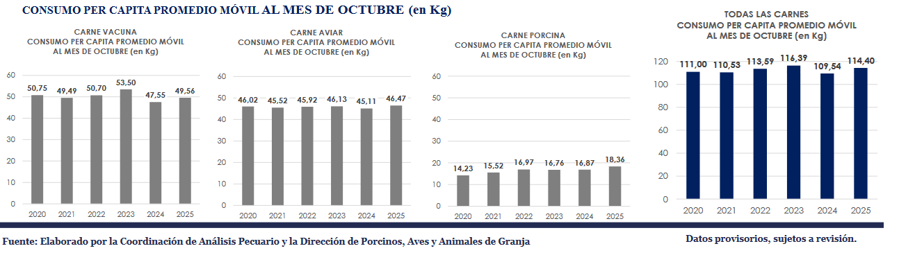 En lo que respecta al consumo de proteínas cárnicas, la manera adecuada se medir la evolución del mismo es sumando todas las fuentes: bovina, porcina y aviar. En ese sentido, luego de un retroceso registrado en 2024, este año el consumo de esas tres proteínas por parte de los argentinos creció para superar los niveles registrados entre 2020 y 2022, aunque sigue por debajo del registro de 2023.
