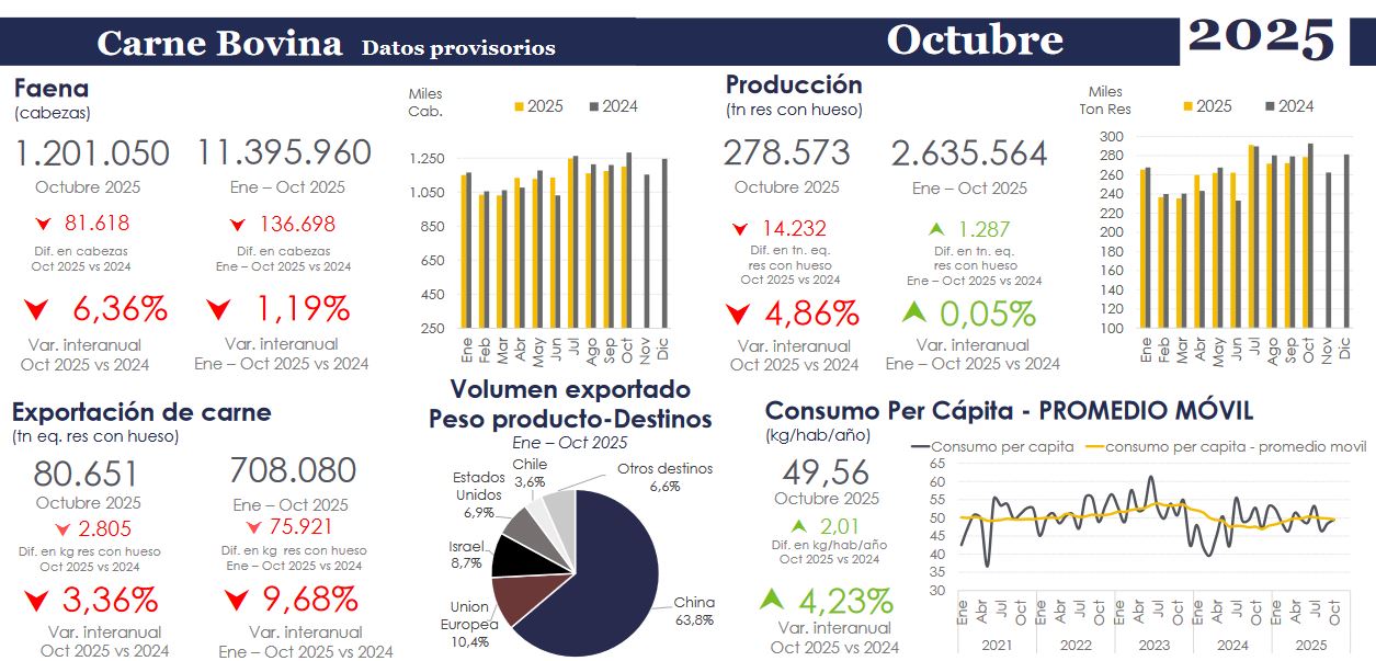 En los primeros diez meses de 2025 –último dato oficial actualizado– la Argentina produjo 2,63 millones de toneladas res con hueso de carne vacuna y exportó 708.050 toneladas, lo que implica que apenas el 26,8% de la oferta generada se destinó al mercado externo. No se “vende todo afuera”; los argentinos seguimos siendo, por lejos, el principal cliente del sector ganadero.