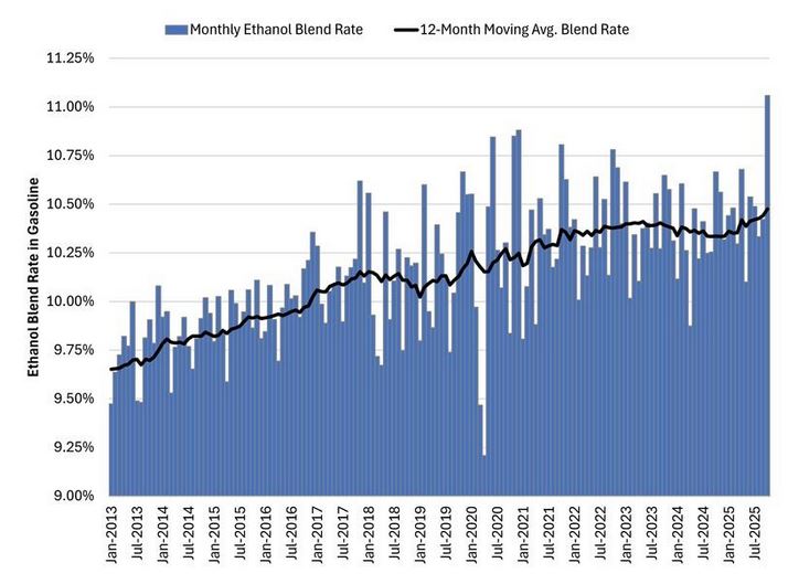 En octubre pasado –según el último dato oficial disponible– el bioetanol en EE.UU. registró un corte efecto del 11,0% con la nafta, lo que representa un marca histórica.