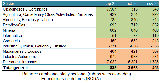 Debido a esa medida, en octubre y noviembre pasado el ingreso neto de divisas generado por el sector agroindustrial (oleaginosos y cereales) fue de apenas 315 y 540 millones de dólares respectivamente y ningún otro sector pudo compensar ese “bache”, ya que el aporte de otros sectores no resultó suficiente para atender las diferentes demandas de divisas.