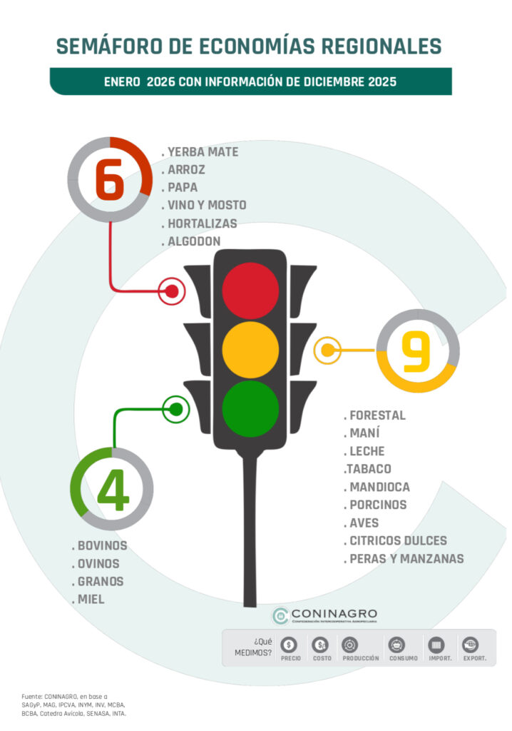 Hace más de diez años que Coninagro realiza su ya tradicional “semáforo de las economías regionales”, informe que se publica mensualmente y que refiere al estado en el que se encuentran 19 actividades productivas del país. Ese tiempo ha permitido realizar diagnósticos a más largo plazo, con algunas conclusiones no tan felices.
