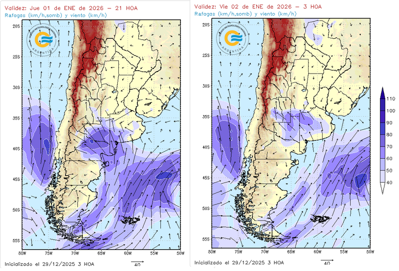 El meteorólogo señala que se prevé el ingreso de un segundo frente frío que avanzará sobre el centro del país hacia el final del primer día del año 2026 para promover ráfagas en el sur en La Pampa y de Buenos Aires; posteriormente, el fenómeno se extendería durante el día 2 de diciembre sobre Cuyo y la parte más central de la Argentina.