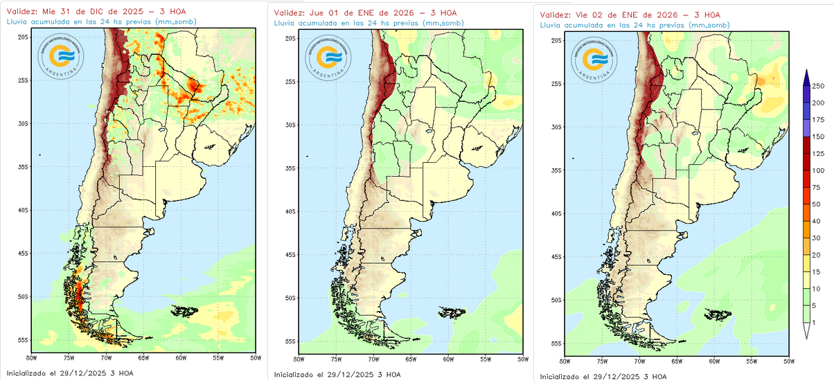 Los mayores acumulados de precipitaciones sobre Cuyo y el norte argentina se experimentarían el último día del año, mientras que el jueves y viernes sólo cabrían esperar chaparrones esporádicos.