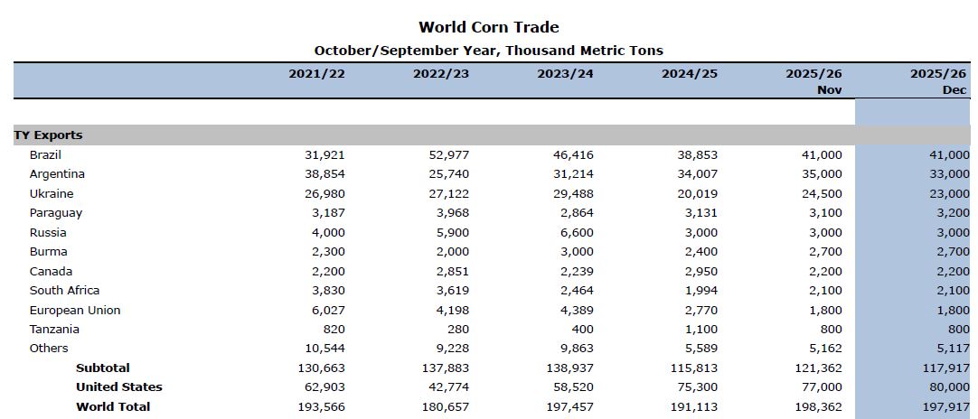 “De cara al futuro, se pronostica que las exportaciones estadounidenses en 2025/26 alcancen los 81,3 millones de toneladas, ya que la sostenida demanda extranjera de importaciones se está satisfaciendo con suministros récord de maíz”, proyectó el USDA.
