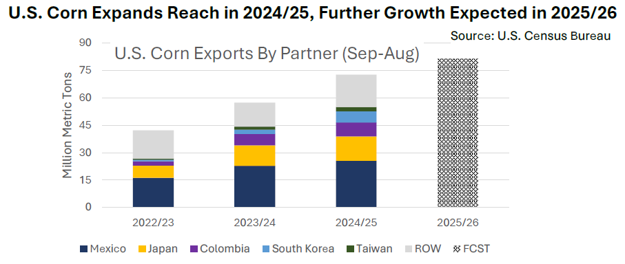 “Se registraron 16 destinos adicionales de venta de maíz en comparación con el ciclo anterior, ampliando la presencia global del maíz estadounidense”, destaca un informe del USDA.