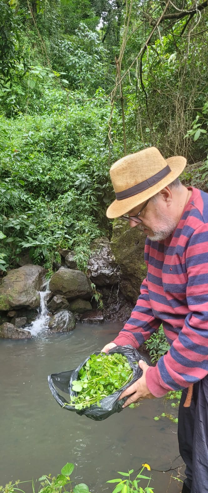 Acerca de su retorno a la vida rural, el músico detalla: “Tenemos un plan de reconversión de nuestras vidas, que es sumar la agricultura a la ‘musicultura’, porque soy horticultor de afición. En 2015, en una parcela de 2 hectáreas situada a unos 40 kilómetros de Posadas emprendimos un proyecto de reserva natural al que llamamos “Itajaretá o “Duende de las Piedras”. Allí hacemos chacra con producción de alimentos para autoconsumo, como mandioca, por ejemplo. Y además, tenemos aves de corral, porque me gusta criar gallinas y gallos finos, de riña, pero no para lucrar con ellos, sino porque me gusta verlos andar y observar sus conductas. Ahora estamos replantando árboles nativos y reteniendo agua en fuentes naturales pequeñas”.