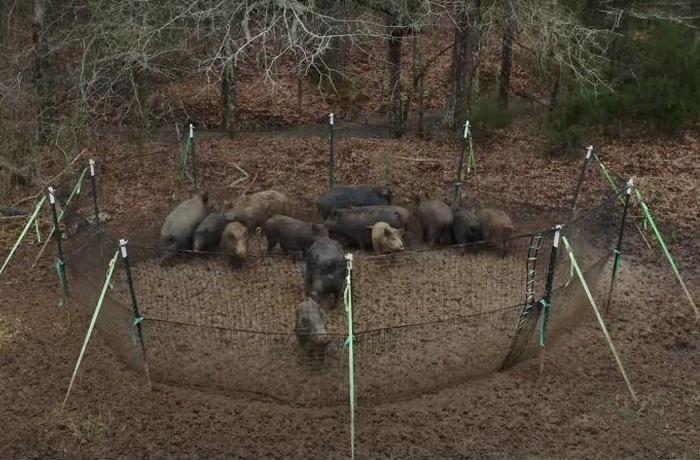 La clave del sistema es que, por cómo está diseñada, la red permite el ingreso de los jabalíes al perímetro para alimentarse pero evita su salida. Como no es ruidosa ni genera movimientos bruscos, permite que varios animales ingresen al mismo tiempo y permanezcan hasta que se vacíe la trampa.