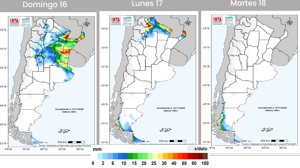 Las zonas con los eventos más severos serían el centro-norte de Entre Ríos, centro de Santa Fe, Misiones y este de Chaco y de Formosa.