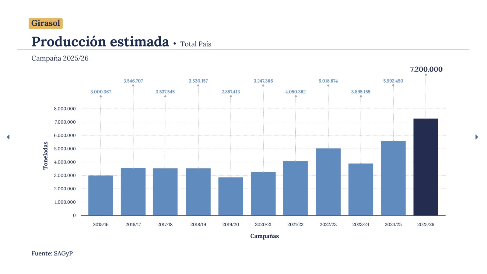 La producción de girasol a nivel país alcanzará 7.200.000 toneladas, un récord de las últimas 10 campañas, lo que responde al adecuado manejo agronómico de los productores y a las buenas condiciones climáticas.