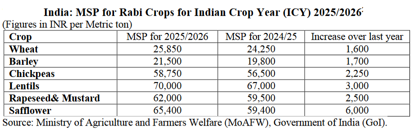 El pasado 1 de octubre el Comité de Asuntos Económicos del Gabinete del gobierno de India aprobó el aumento de los precios mínimos para todos los cultivos de siembra de invierno (rabi) del ciclo 2025/26. El mayor aumento se registró para el cártamo, seguido de las lentejas, la colza y la mostaza, el garbanzo, la cebada y el trigo.