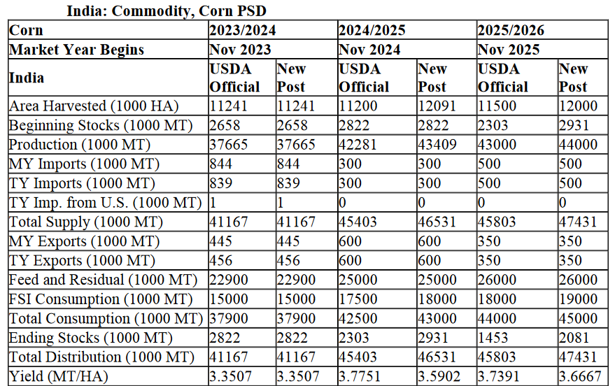 “El monzón de 2025, oportuno y bien distribuido, junto con condiciones climáticas favorables en los principales estados productores, respaldarán las perspectivas de buenos rendimientos de maíz”, apunta el documento.