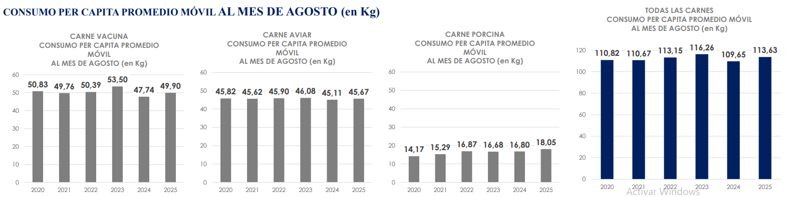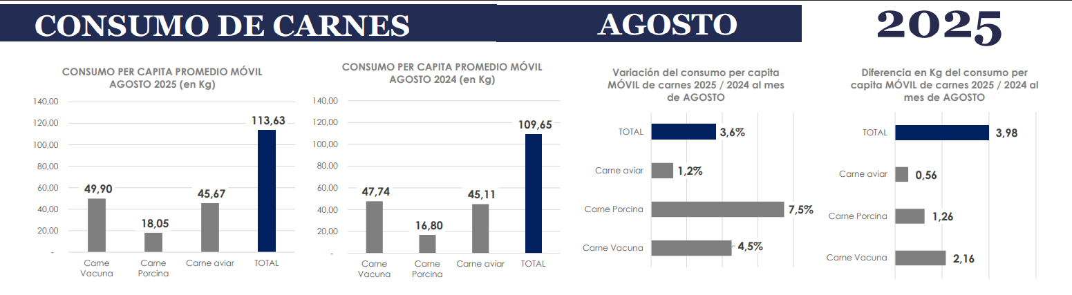 El productor entonces más afectado fue la carne vacuna, que entonces (en los primeros ocho meses de 2023) había registrado niveles de consumo de 53,5 kilos per cápita, un año después (2024) retrocedía bruscamente a 47,74 kilos, y ahora (2025) se recupera parcialmente hasta los mencionados 49,90 kilos.