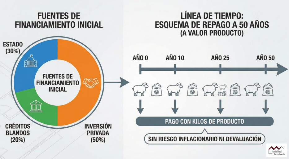 Para que el productor patagónico financie parte de esta obra, el repago no es en pesos fijos, sino a “valor producto” (kilos de lana, carne o carbono), con la misma metodología empleada ya en varios créditos agropecuarios: si el precio del producto baja, la cuota tambié.