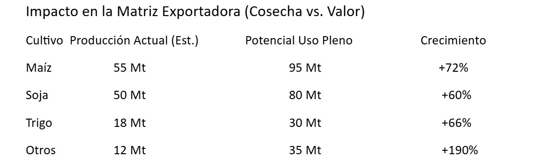 El motor principal de esta revolución es la agricultura. Si hoy Argentina se debate en la zona de las 130-140 millones de toneladas (dependiendo del humor del clima), el uso pleno del suelo proyecta un horizonte de 240 millones de toneladas anuales. Este crecimiento del 77% no es una expresión de deseos, sino el resultado de tres movimientos tácticos: