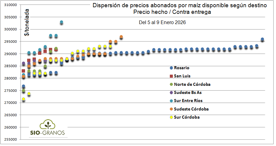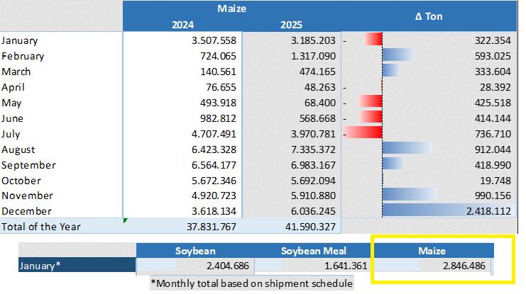 A nivel regional, Argentina tiene “liberado el terreno”, ya que la entidad que agrupa a los agroexportadores brasileños (Anec) esta semana proyectó que en el presente mes de enero Brasil embarcaría 2,84 millones de toneladas versus 3,18 millones en el mismo mes de 2025. Brasil estará virtualmente retirado del mercado hasta julio, cuando se registra el ingreso de la cosecha de maíz tardío.