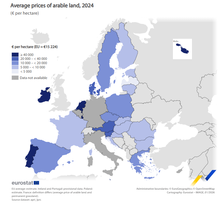 En 2024, el precio medio de una hectárea de tierra cultivable en la UE se estimó en 15 224 euros (unos 18.000 dólares), lo que supone un aumento del 6,1 % con respecto a 2023, cuando ese valor promedio se ubicó en 14 343 euros.