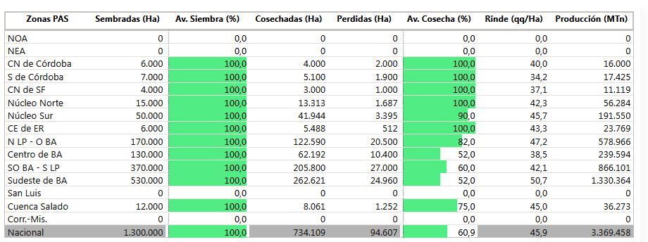 Al 30 de diciembre pasado, según el último dato informado por a Bolsa de Cereales de Buenos Aires, se había recolectado el 60% del área nacional de cebada para generar una oferta de 2,26 millones de toneladas (forrajera + cervecera).