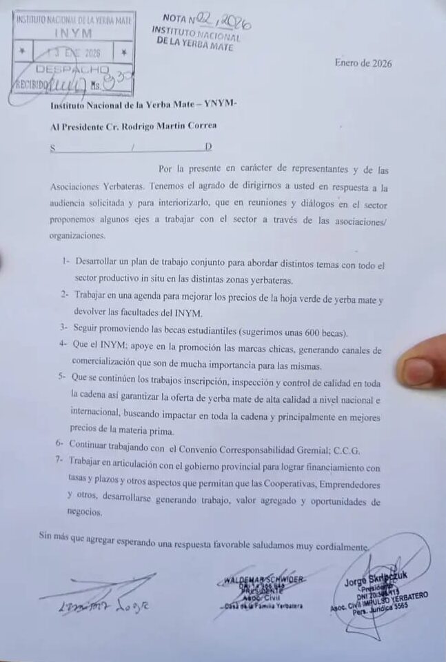 ¿Qué se discutió finalmente en el encuentro con Correa? “Acercamos 7 puntos y nos contaron en qué vienen trabajando”, contó a este medio Jorge Skripczuk, uno de los 4 elegidos para asistir al INYM en representación de Impulso Yerbatero, una de las asociaciones más nuevas del sector.