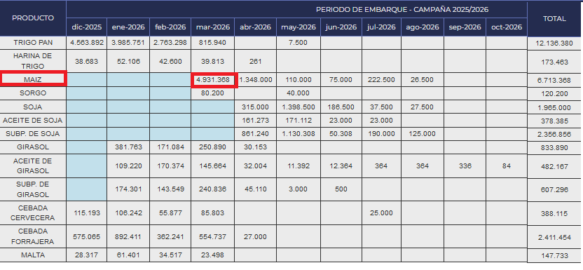 “Teniendo en cuenta las toneladas embarcadas y las que restan por hacerlo durante el mes de marzo, el programa exportador para el primer mes de la campaña de maíz indica que será récord, superando las cinco millones exportadas del cereal”, apunta el informe.