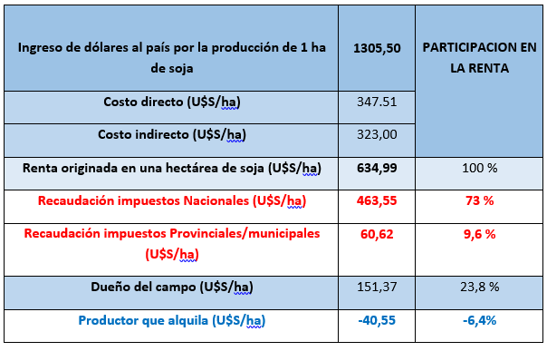 “Si a lo que ingresa por hectárea de soja en Argentina, le restamos el costo total por hacerla producir, obtendremos la renta de esa hectárea de soja. Lo interesante es saber cómo se distribuye esa renta entre los distintos actores de la cadena. Y por lo que observamos es el Estado (Nacional, provinciales y municipales) el que aprovecha de la misma, quedándose con el 82,6 %”, sostuvo Roulet respecto de las estimaciones realizadas para la cosecha próxima a comenzar.