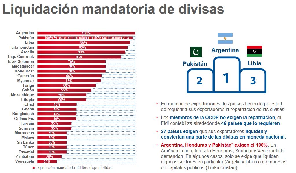 1.Eliminar la liquidación obligatoria de divisas producidas por ventas de exportación de bienes. Se trata de una exigencia que está presente en naciones como Pakistán, Libia, Turkmenistán, Argelia y República Central Africana en una proporción mayor al 86% de la operación de exportación, mientras que en Madagascar y Honduras la proporción es del 70%.