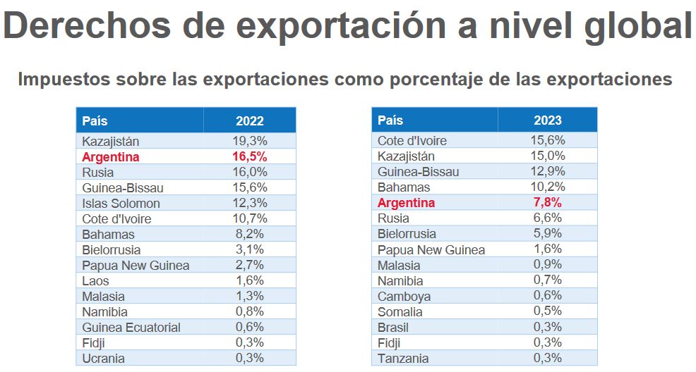 2.Seguir eliminando derechos de exportación, impuesto que no es empleado por países normales. En 2023 tan solo 28 países aplicaban retenciones. En 2022 la Argentina se ubicó en la segunda posición en cuanto a la presión de este impuesto sobre las exportaciones (16,5%), mientras que en 2023 descendió al quinto puesto, pero como producto de la sequía que impactó negativamente en las exportaciones agrícolas que sufren las mayores alícuotas de retenciones.