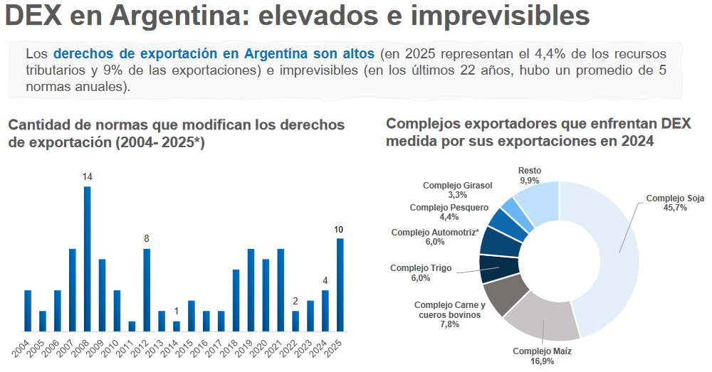 Los derechos de exportación en Argentina son altos (en 2025 representan el 4,4% de los recursos tributarios y 9% de las exportaciones) e imprevisibles (en los últimos 22 años hubo un promedio de cinco normas anuales)