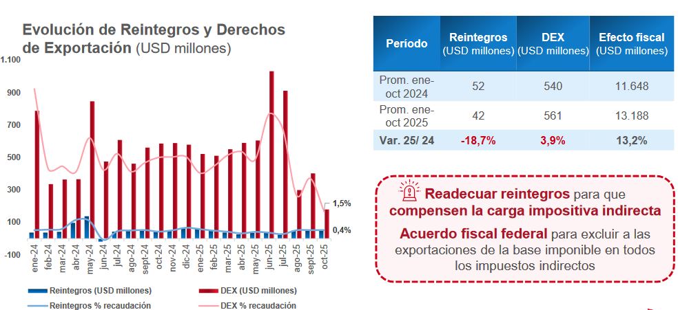 3.Readecuar los reintegros a las exportaciones para que compensen la carga impositiva indirecta. Argentina es un país que exporta impuestos. Los derechos de exportación superan a los reintegros; más allá de eso, los reintegros a las exportaciones no compensan la carga impositiva indirecta que enfrentan los exportadores. Existen además casos extremos, donde los productos reciben cero reintegros en un esquema en el cual los impuestos nacionales, provinciales y municipales se han incrementado a lo largo de las últimas décadas.