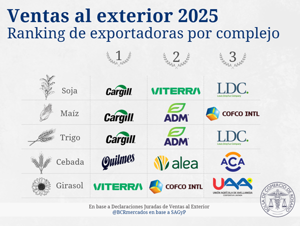 La Bolsa de Comercio de Rosario (BCR) se tomó el trabajo de ordenar todos los registros de Declaraciones Juradas de Ventas al Exterior (DJVE) de granos y subproductos para confeccionar, una vez más, el ránking de empresas agroexportadoras. De allí salió que la firma estadounidense Cargill volvió a ubicarse en el primer lugar del podio, pero la verdadera noticia no es esa sino la distancia que le sacó al resto de las cerealeras y aceiteras.
