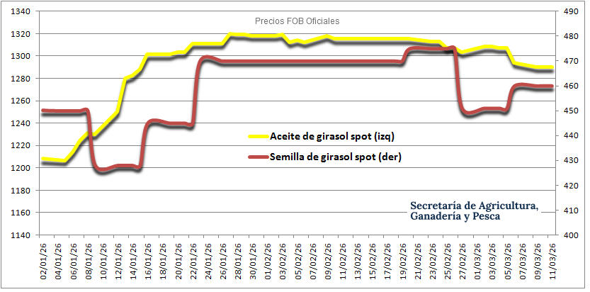 El precio FOB del aceite del girasol argentino publicado por la Secretaría de Agricultura para embarques inmediatos (spot) arrancó el año 2026 en 1208 u$s/tonelada para tocar un máximo de 1320 u$s/tonelada el 27 de enero, luego de lo cual comenzó a descender de manera progresiva hasta los actuales 1290 u$s/tonelada.