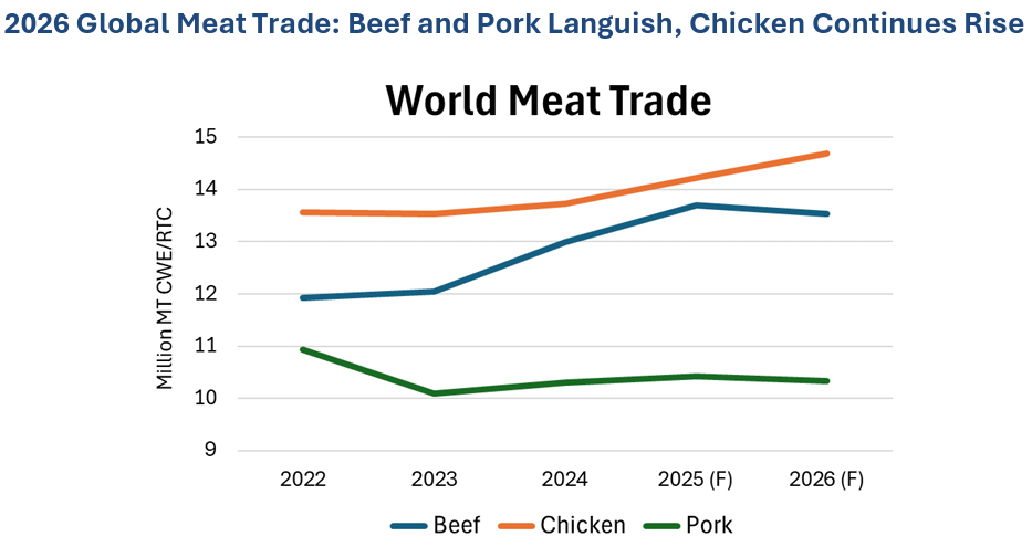 “Estados Unidos enfrentará en 2026 un escenario de menor disponibilidad de ganado, con una caída del 1% en la producción de carne vacuna. La falta de novillos y vaquillonas para feedlots, agravada por las restricciones a la importación de ganado mexicano, limita la oferta doméstica, especialmente de carne magra destinada a procesamiento”, dice el documento.