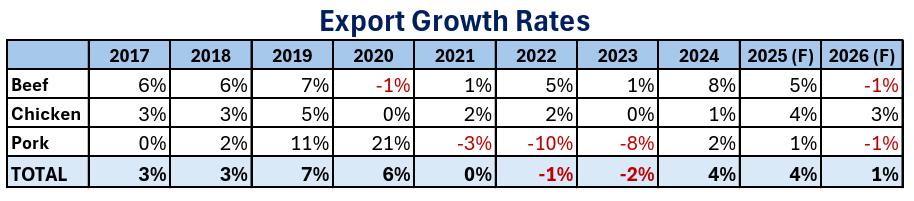 Esta situación “llevará a un mayor ingreso de carne importada, que crecería 2% hasta 2,5 millones de toneladas, favorecido además por menores aranceles en mercados clave. En sentido contrario, las exportaciones estadounidenses caerían 4%, hasta 1,1 millones de toneladas, presionadas por la escasez interna, la competencia australiana y la falta de acceso al mercado chino”.