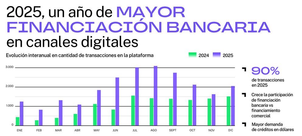 El informe destaca que el volumen de transacciones para el financiamiento de insumos en la plataforma casi se duplicó respecto a 2024. Este crecimiento guarda una estrecha correlación con la dinámica del mercado general, donde la demanda de crédito bancario se intensificó como respuesta directa a la merma en la oferta de financiación comercial.
