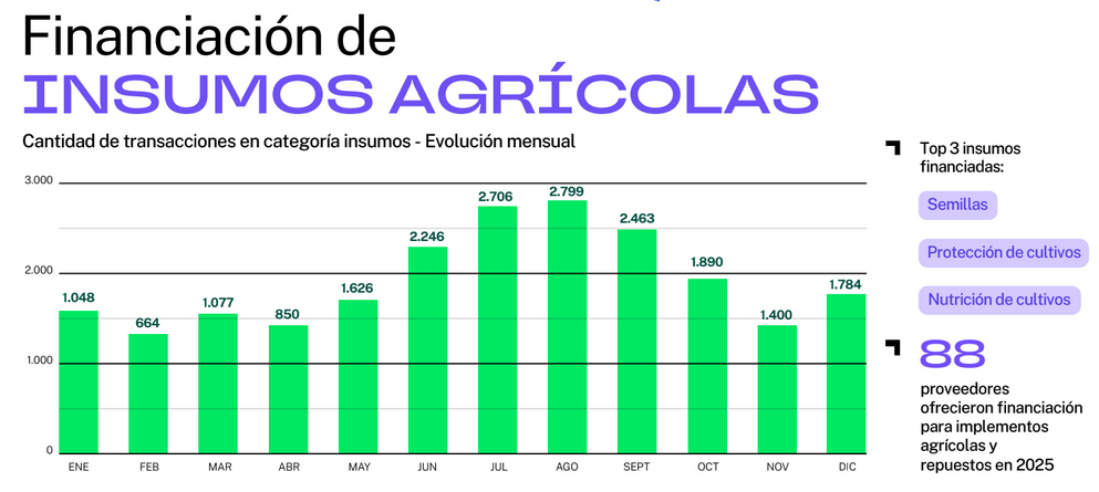La plataforma ofrece convenios especiales para financiar protección de cultivos, semillas, fertilizantes y combustibles. Los picos de operación más grandes se registraron en la previa de la campaña gruesa, representando el 44% del volumen anual de transacciones en 2025.