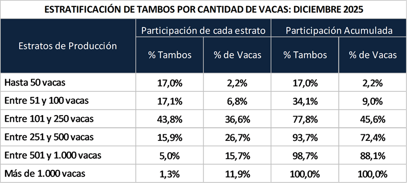 En el extremo opuesto, los tambos con menos de 100 vacas son cerca del 34,1 % del total, tienen solo el 9 % de las vacas y generan menos del 10 % de la producción.