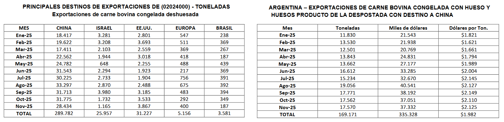 En los primeros once meses de 2025, según el último dato oficial disponible, Argentina exportó a China 289.782 toneladas de cortes bovinos deshuesados congelados a un precio medio de 4844 u$s/tonelada y 169.171 toneladas de carne congelada con hueso y huesos con carne a un precio promedio de 1982 u$s/tonelada.