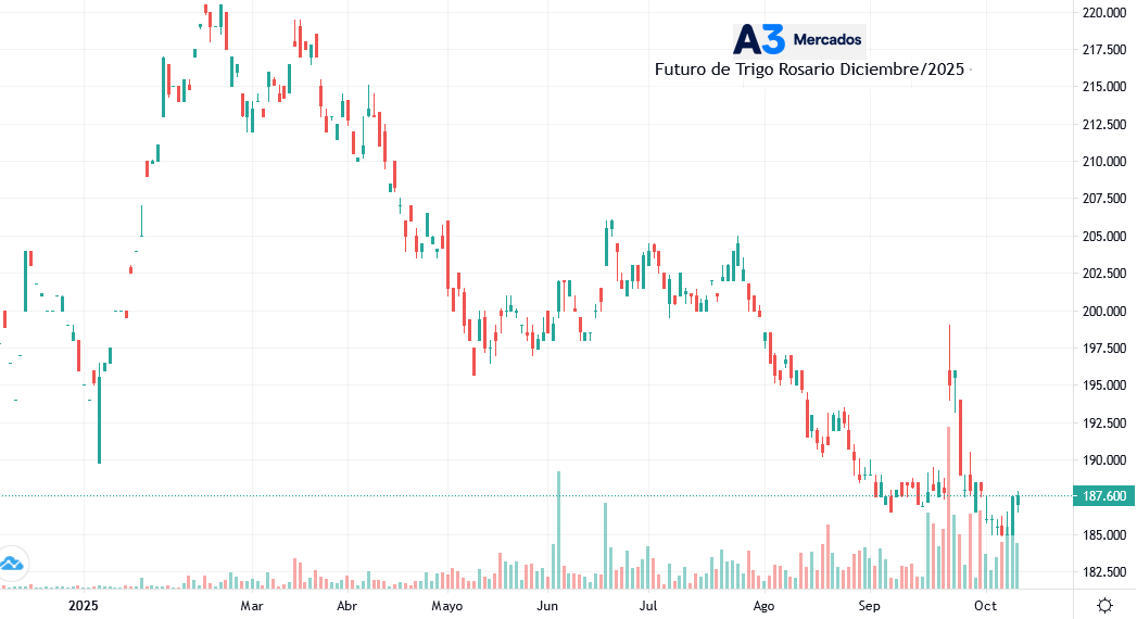 En lo que respecta al mercado de futuros agrícolas A3, el lunes 22 de septiembre se negociaron apenas 104.000 toneladas de contratos de Trigo Rosario 2025/26, mientras que el 23 de septiembre la cifra fue de 68.000 toneladas. En ambas jornadas hubo posibilidad de capturar precios superiores a los 195 u$s/tonelada.