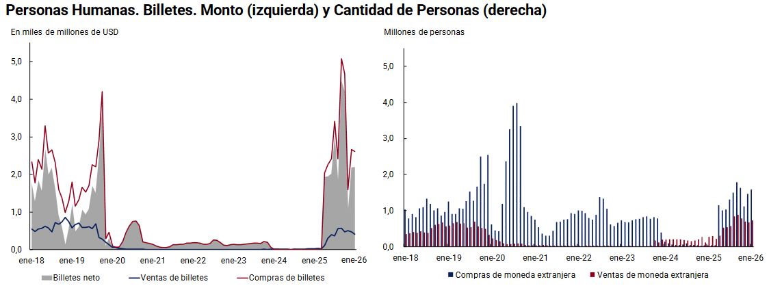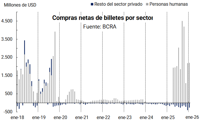 En enero pasado 1,6 millones de argentinos con capacidad de ahorro realizaron compras brutas en el Mercado Único y Libre de Cambios (MULC) por 2613 millones de dólares, mientras que otros 730.000 debieron vender 410 millones de dólares para poder sobrevivir. Por lo tanto, en términos netos, se fueron del sistema 2203 millones de dólares.