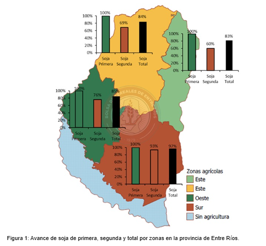 El informe técnico señala que la soja de primera ya fue implantada en su totalidad a nivel provincial, y que el avance de siembra de la soja de segunda se ubica en aproximadamente 80 por ciento. Si se considera la implantación total proyectada, el avance ronda el 87%, equivalente a alrededor de 1.000.000 ha sembradas, con cerca de 150.000 ha aún por implantar en distintas regiones entrerrianas.