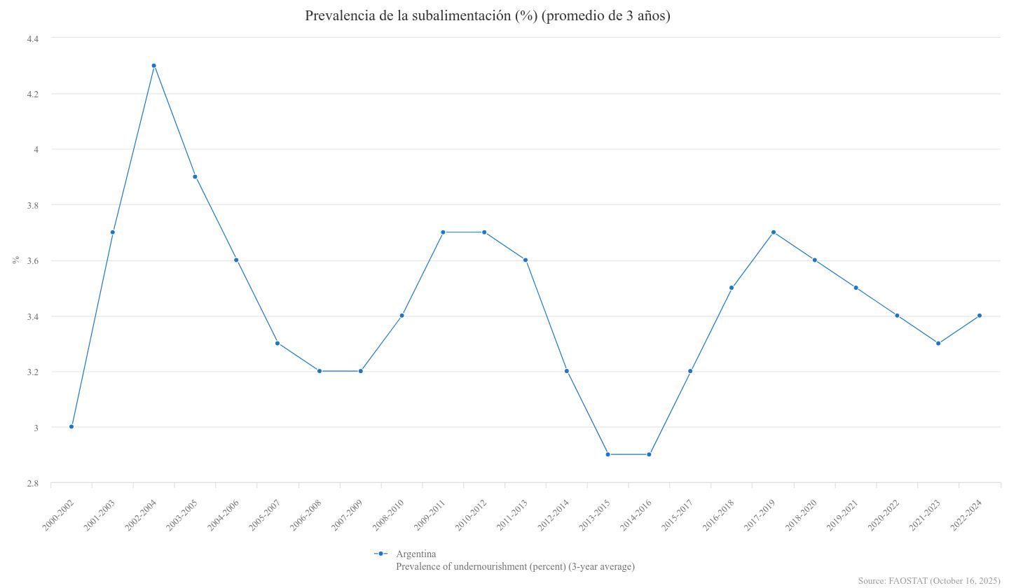Este nuevo gráfico marca que no siempre se ha tenido tanto éxito, incluso en países donde hay un excedente de alimentos como la Argentina. En el trienio 2022/24, como en el resto del mundo, la tasa de subalimentación ha aumentado también aquí, para ubicarse en el 3,4% de la población total.