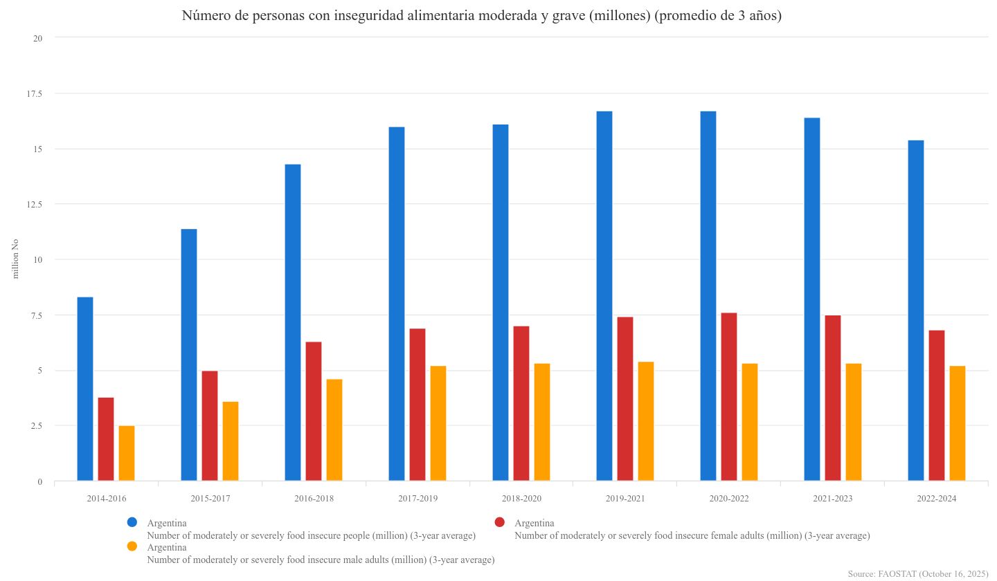 Los números fríos de la estadística de FAO también son una invitación a pensar en el asunto. Por ejemplo, y siempre hablando del caso argentino, las cifras crecen a 15,4 millones de personas cuandos e habla de inseguridad alimentaria moderada. Esto ya no es joda, porque equivale al 33% de la población total del país.