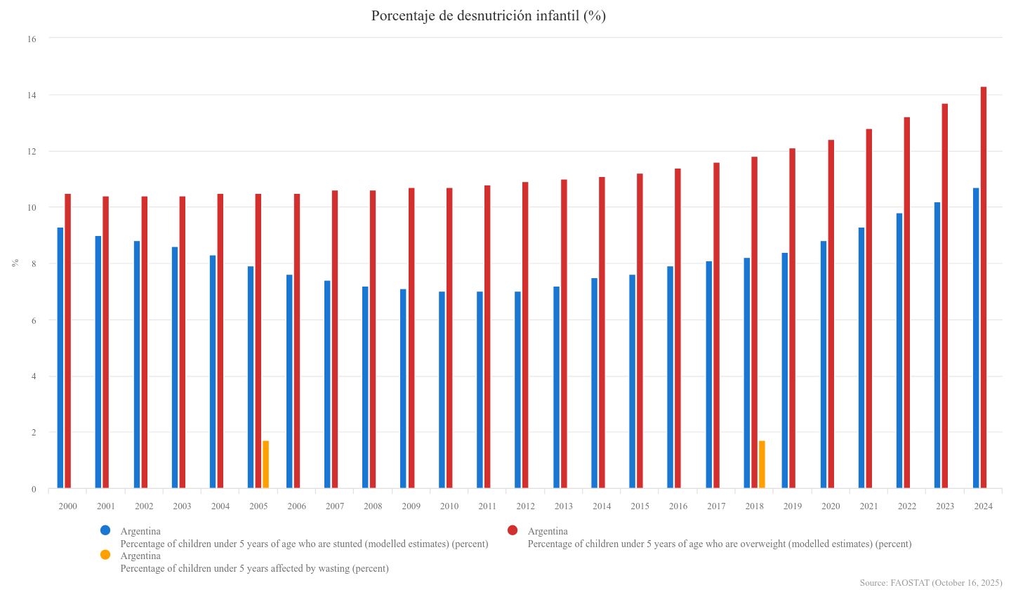 Que el tema debe ser encarado con mayor profundidad es obvio, sobre todo si pensamos que los más afectados por una mala alimentación son los niños. De hecho, otro gráfico de la FAO refleja el crecimiento de la desnutrición infantil en el país de la soja, el trigo y las vacas. afecta a entre 10 y 15% de los niños de menos de cinco años.