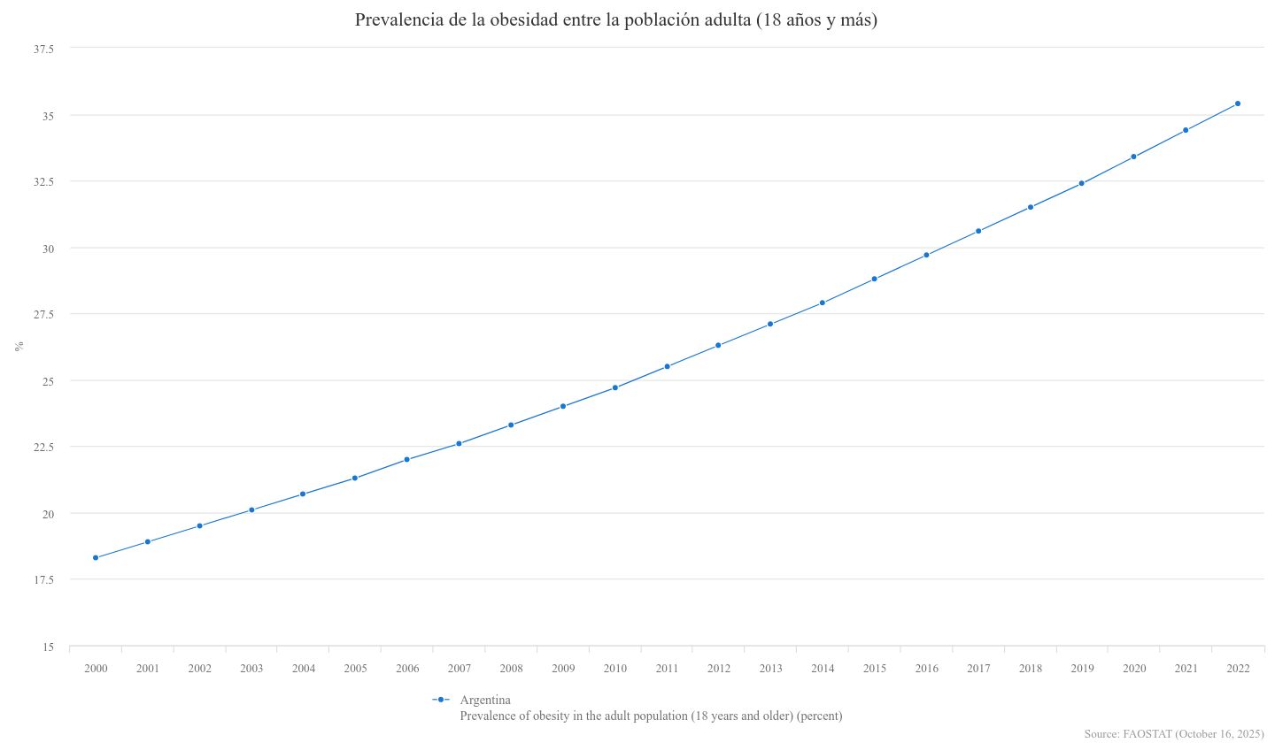 Nadie está a salvo de una mala alimentación. Ni siquiera quienes reciben alimentos en abundancia. Este último gráfico de la FAO muestra como en Argentina hay una muy elevada prevalencia de obesidad en la población adulta: el fenómeno de la gordura por mala alimentación viene creciendo sin prisa y sin pausa y ya afecta a más de 35% de la población.