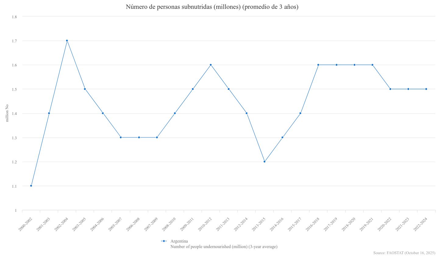 Este gráfico muestra el número de personas subnutridas que hay en la Argentina. y que ha subido de modo alarmante desde principios del milenio. Según la última medición trianual, son 1,6 millones de compatriotas.