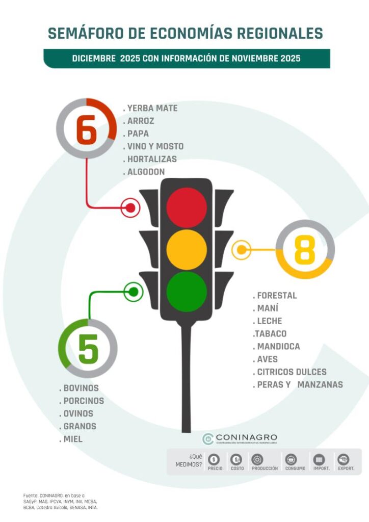 Desde 2016, Coninagro publica mensualmente su “semáforo de economías regionales”, un registro que evalúa a 19 actividades de acuerdo a ciertos parámetros -negocio, productivo y mercado- y las califica con los colores rojo, amarillo o verde de acuerdo al resultado que arrojen.