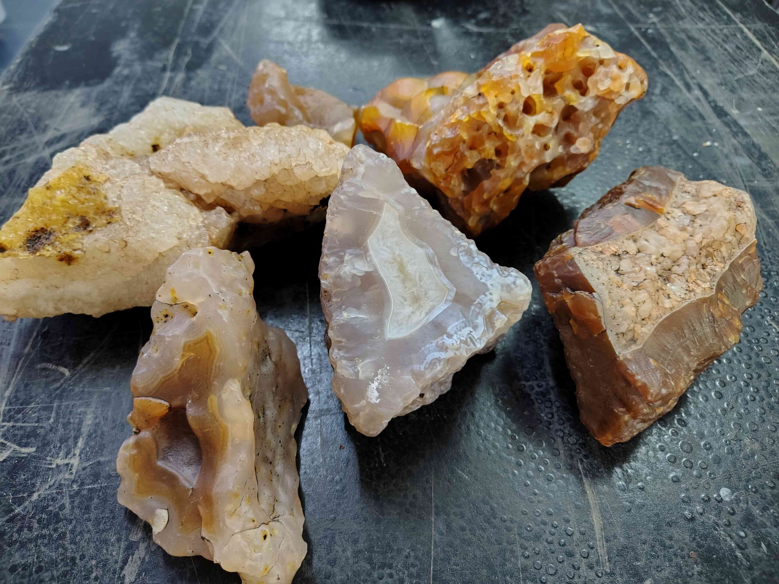 Cada integrante tiene su piedra preferida y Mónica se inclina por el jaspe, “porque no dice nada hasta que la abrís y ahí te deslumbra”. También trabajan con ágatas de colores diversos y con obsidianas, que son vidrios volcánicos: blandas, fáciles de trabajar, pero frágiles. En la zona se encuentran tres tipos: negra, nevada (con manchitas blancas) y tigrillo (marrón con manchas negras). Y también están los cuarzos, infinitos en sus tonalidades.