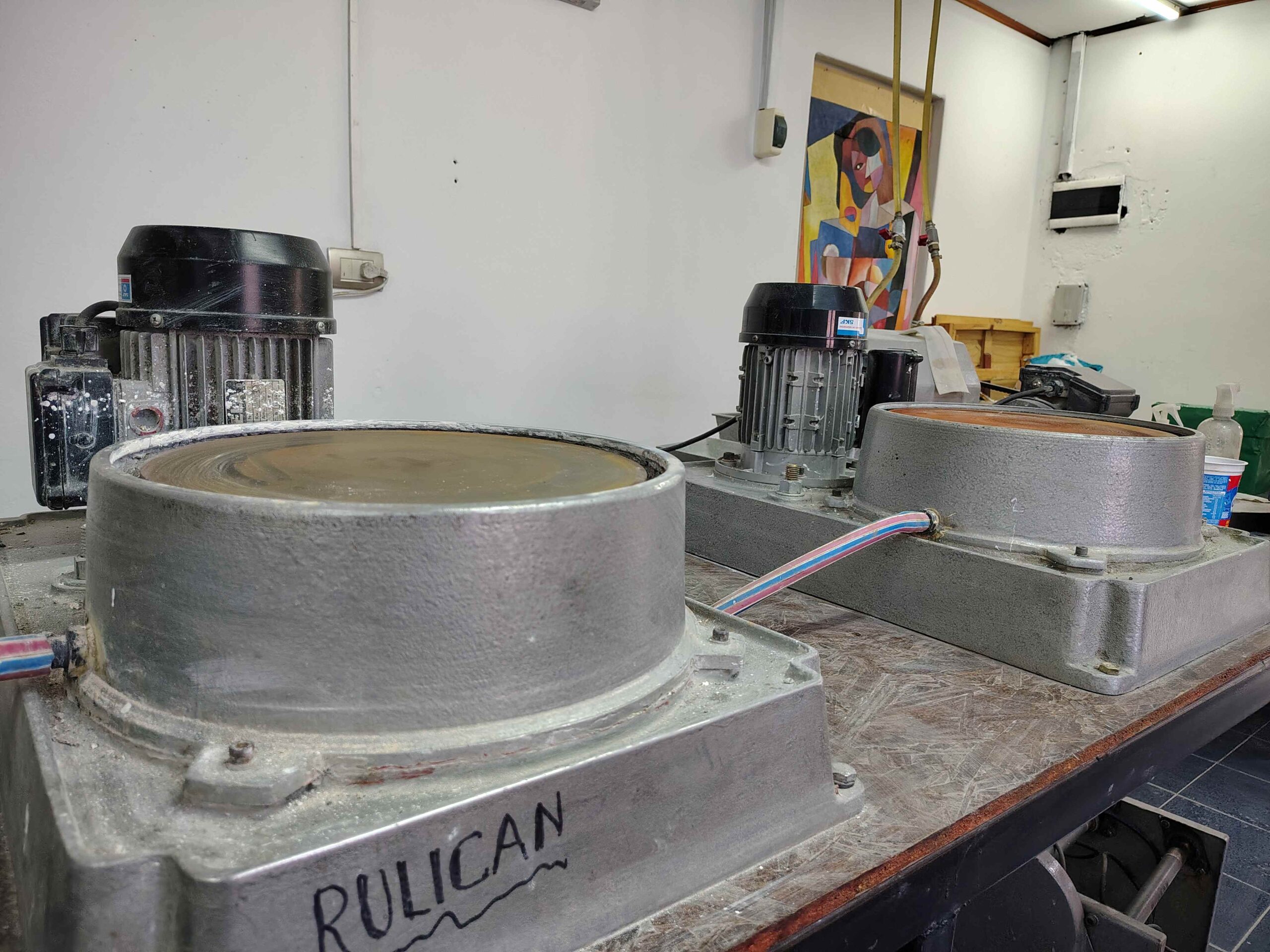 Las piedras ornamentales, en cambio, se trabajan en un tambor que gira durante cuarenta días. “Metemos diez kilos de piedras con un kilo de abrasivo”, explica. “Después se limpian, se cambian los abrasivos y se vuelven a poner diez días más, y así varias veces”.
