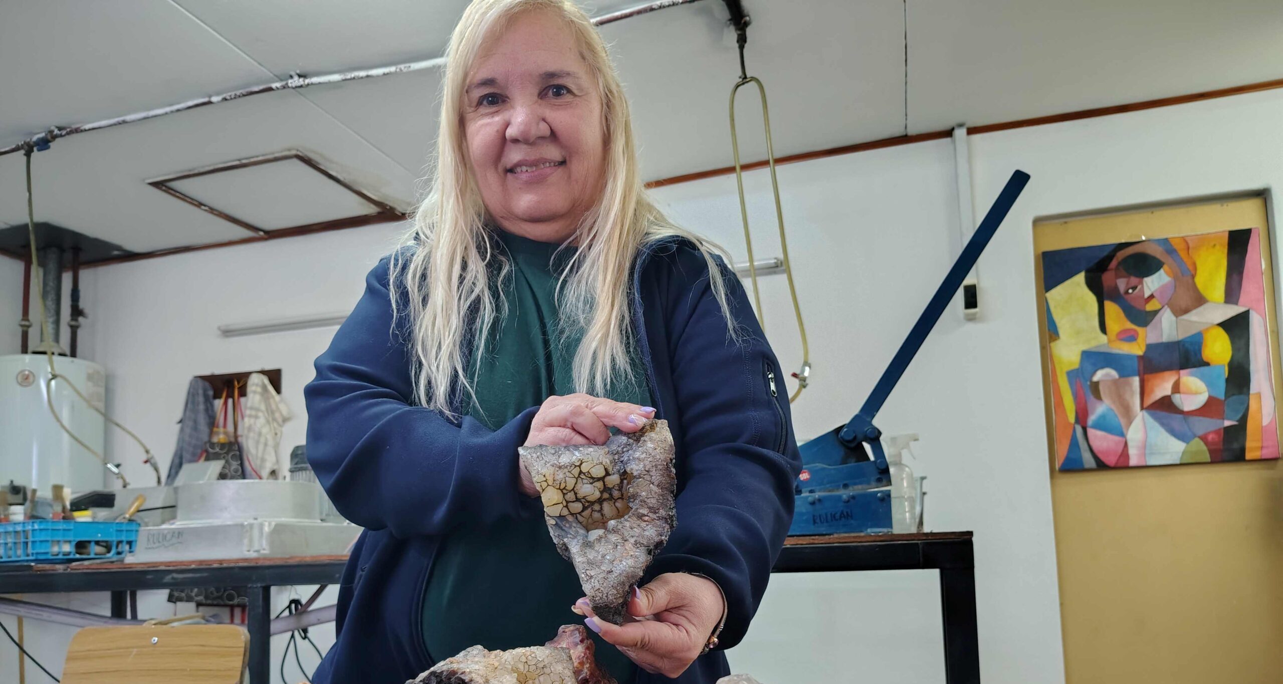 Estamos en Rulican, taller municipal de lapidado de Gobernador Gregores, Santa Cruz. Aquí, todas las tardes se escucha el zumbido de una sierra cortando piedra y el golpeteo rítmico del cincel y del martillo manejados por mujeres que encontraron en esto una vocación que también muestra que las piedras no son solo minerales sino pequeñas cápsulas de historia y de historias.
