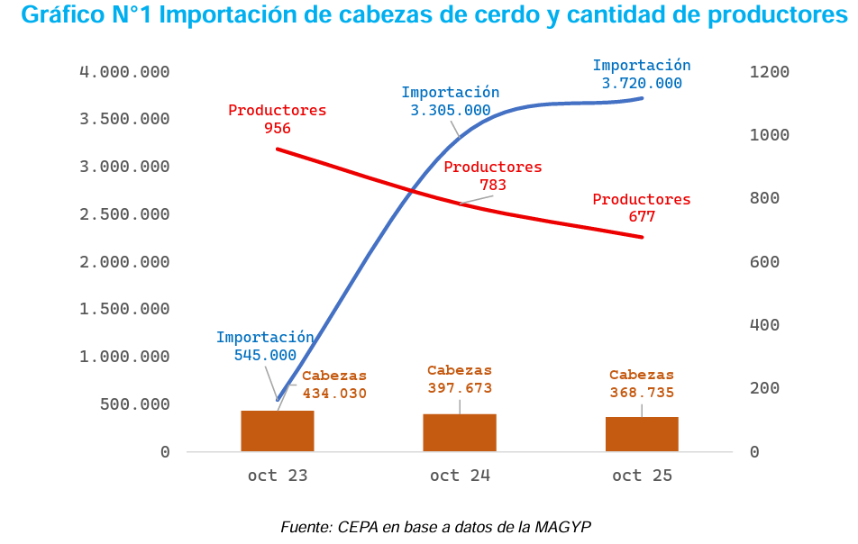 “Se puede observar que la importación de cabezas de cerdo se incrementó considerablemente: pasó de 545.000 en octubre 2023, a 3.720.000 en octubre de 2025, según datos de la secretaría de Agricultura, Ganadería y Pesca de la Nación. Esto impactó directamente en la cantidad de productores porcinos del país: entre octubre 2023 y octubre 2025 se perdieron 279 productores”, señalaron. Eso derivó en una concentración de la producción, donde cada ganadero que siguió en pie pasó a tener un 20% más de cabezas.