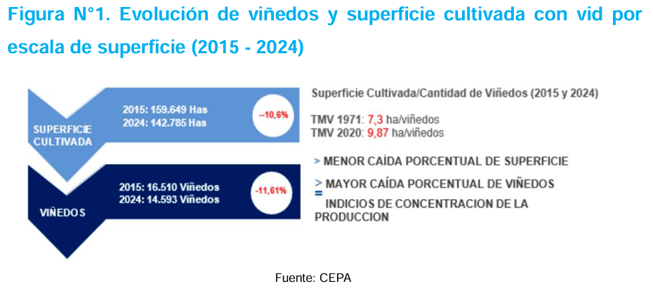 El deterioro también alcanzó al complejo vitivinícola: “los costos internos subieron con fuerza (74% más entre 2023 y 2025), mientras el tipo de cambio real se apreció”. Respecto de la concentración, “aunque el 75% de los viñedos tiene menos de 10 hectáreas, solo representan el 25,8% de la superficie total, mientras que el 7,4% más grande concentra casi el 45%”.
